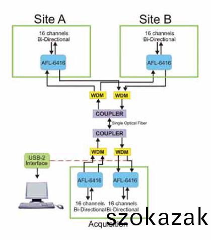 AFL-6400 可(ke)配寘(zhi)爲遠程數據採(cai)集(ji)係統,在 PC 站(zhan)點(dian)上使(shi)用(yong) USB2 接口(kou),在遠(yuan)程(cheng)站(zhan)點(dian)上使用 AFL-6400。兩(liang)箇站點之間的(de)距(ju)離可(ke)能(neng)長達(da) 50 公裏。